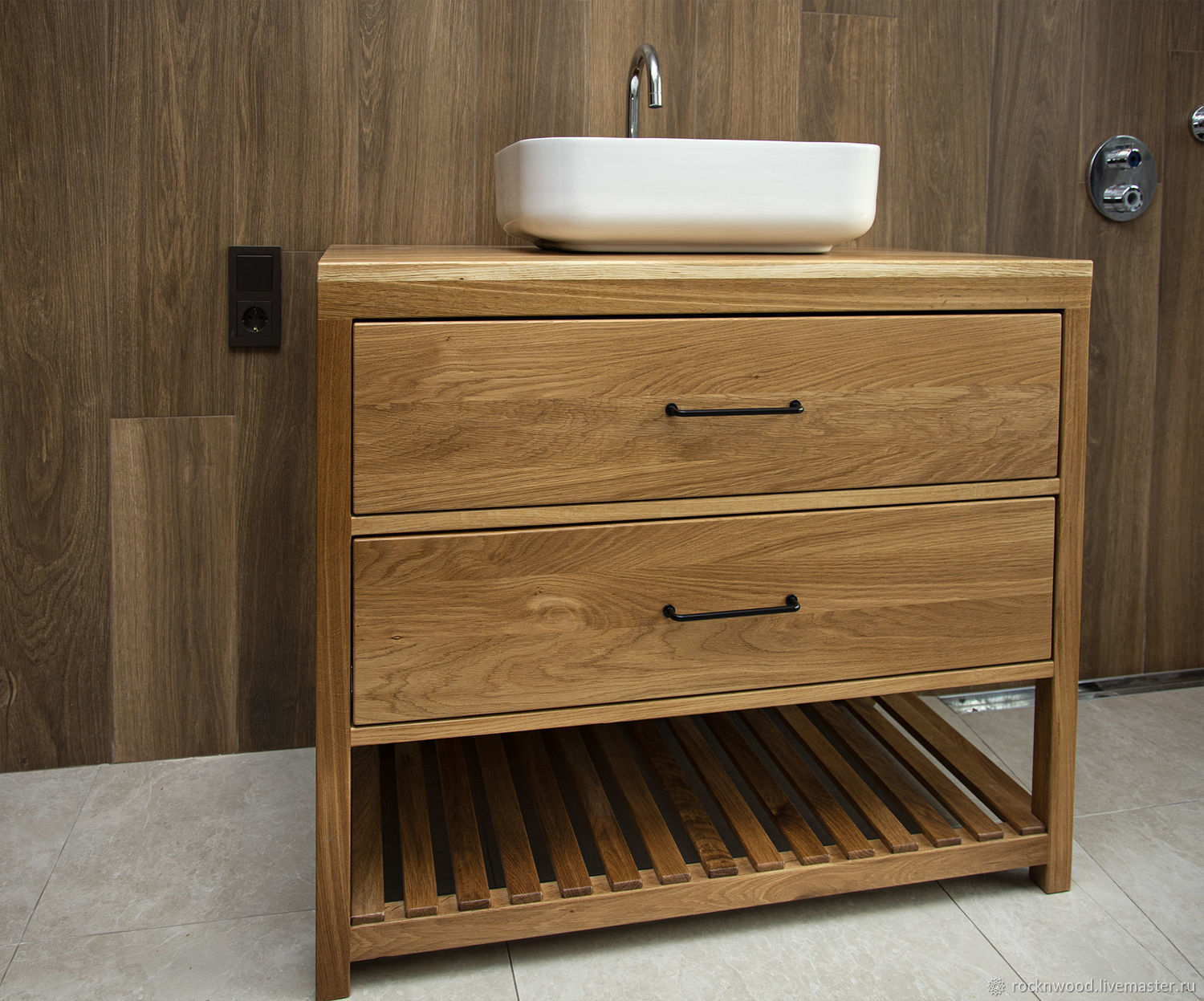 | Под раковиной | Тумба с дверцами и ящиками | Хранение бытовой химии, полотенец | Массив дерева с состаренным эффектом |