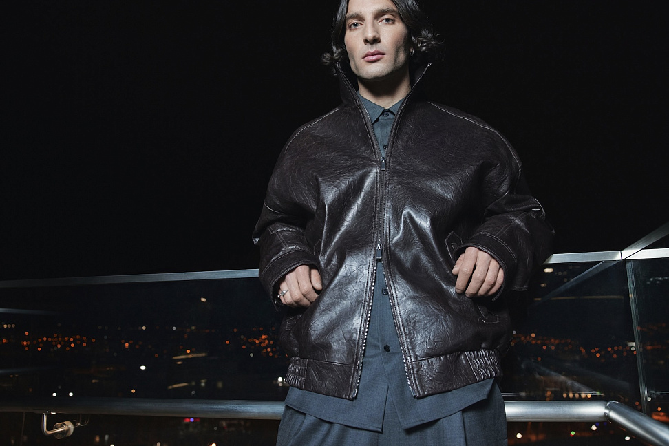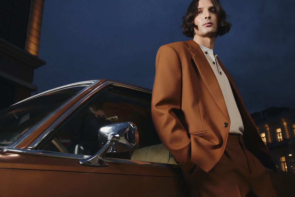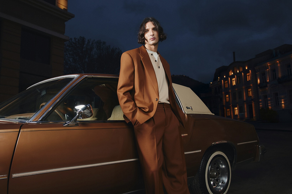 Мужская коллекция включает 23 предмета гардероба: верхнюю одежду, костюмы из шерстяных тканей, трикотаж и деним. Обувь представлена классическими лоферами и полуботинками из натуральной коричневой замши.