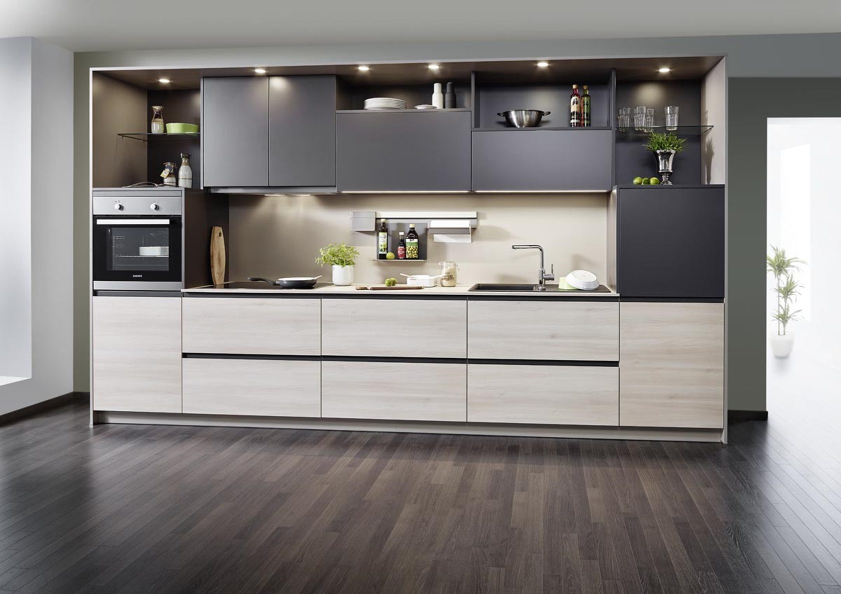 Ручки, навесные системы, полки и другие элементы могут быть из металла, пластика или даже дерева. Главное, чтобы все элементы сочетались по стилю и не уступали по качеству общему уровню мебели.